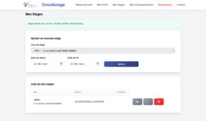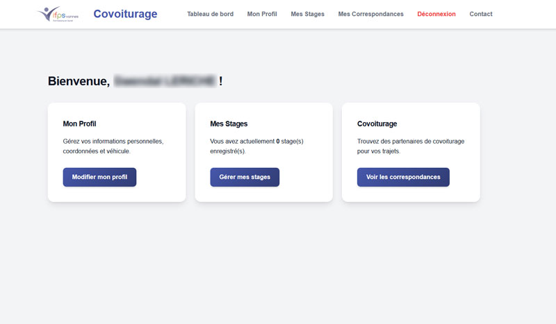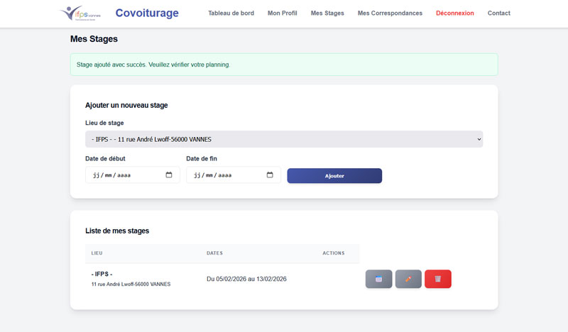 Vous arrivez sur la page d’accueil où vous pouvez gérer vos coordonnées via “Mon Profil“, la liste de vos stages par période via “Mes Stages” et vos correspondances de lieux de stage dans “Covoiturage“.